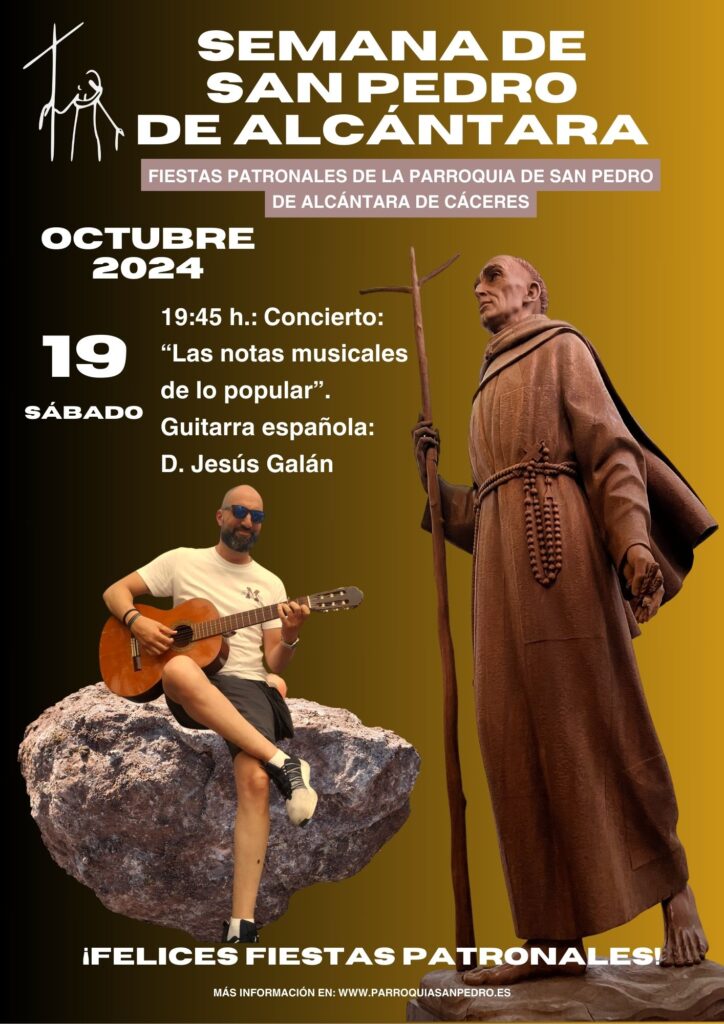 El próximo sábado 19 de octubre, a las 19:45 h., la Parroquia de San Pedro de Alcántara de Cáceres acogerá un especial concierto de guitarra española titulado «Las notas musicales de lo popular». El evento, que se celebrará en el templo parroquial, forma parte del programa de la Semana de San Pedro de Alcántara, titular de la parroquia, y llega como una alternativa al concierto originalmente previsto del grupo «F. y la furgoneta de los cobardes» de rock andaluz, que ha sido pospuesto debido a problemas climatológicos.