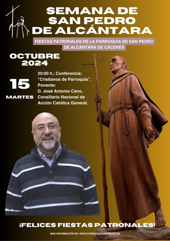 Hoy martes, 15 de octubre, a las 20:00 horas, se celebrará en la Parroquia de San Pedro de Alcántara una conferencia titulada “Cristianos de Parroquia”, a cargo de D. José Antonio Cano, Consiliario Nacional de Acción Católica General (ACG). El evento se enmarca dentro de la Semana de San Pedro de Alcántara, titular de la parroquia, y forma parte del programa de actividades diseñadas para esta importante celebración.