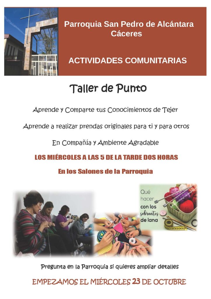 La Parroquia de San Pedro de Alcántara de Cáceres está organizando unos talleres de punto que prometen ser una experiencia enriquecedora para todos los amantes de las labores y quienes deseen aprender a tejer desde cero. Estos talleres, titulados «Taller de Punto: Aprende y Comparte tus Conocimientos de Tejer», se presentan como una oportunidad perfecta para desarrollar habilidades manuales, crear prendas originales y, al mismo tiempo, disfrutar de un espacio de convivencia y aprendizaje en comunidad.