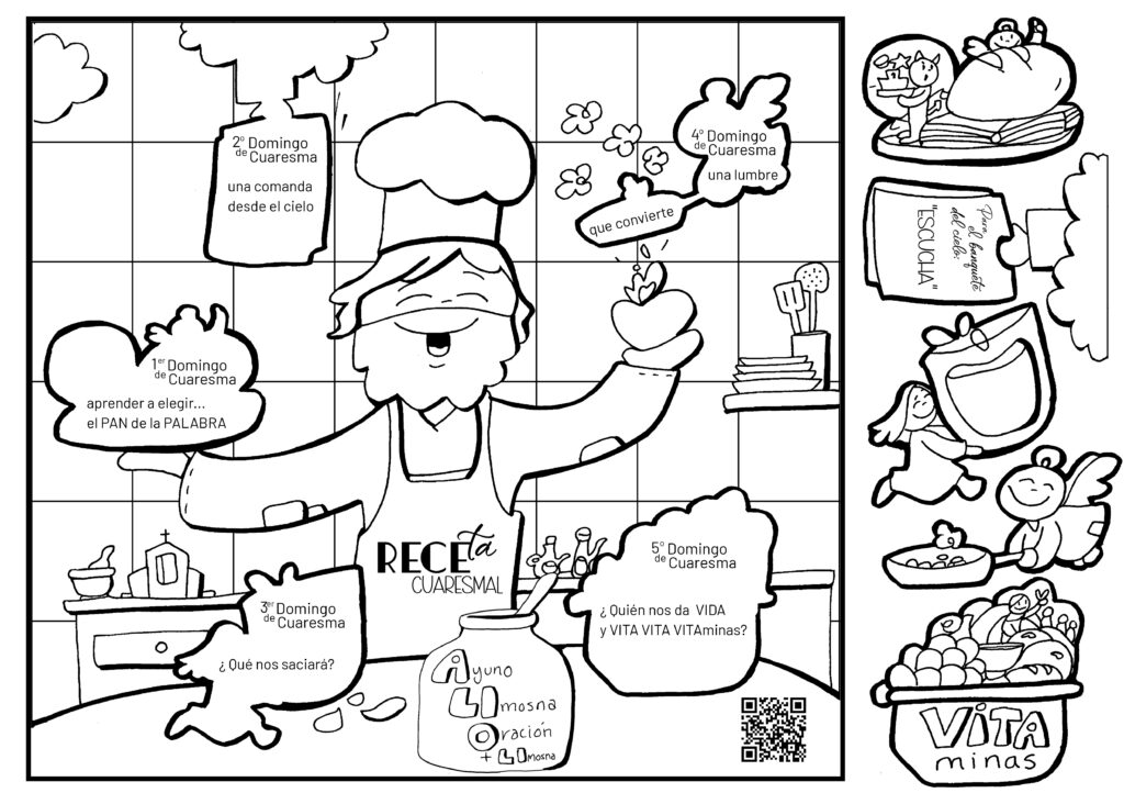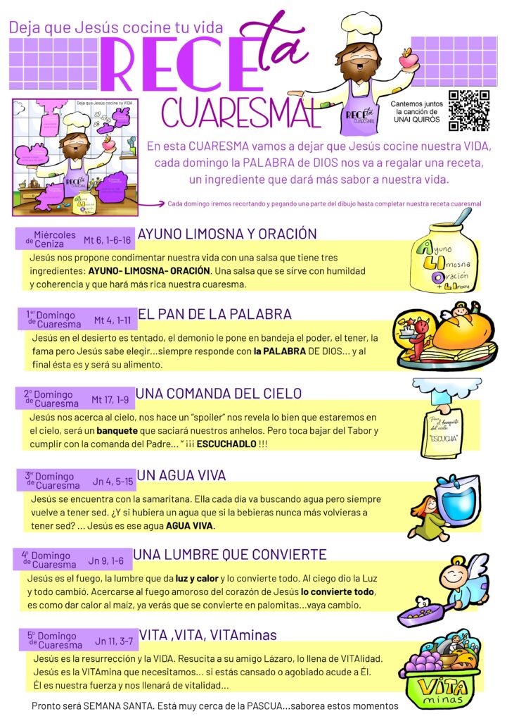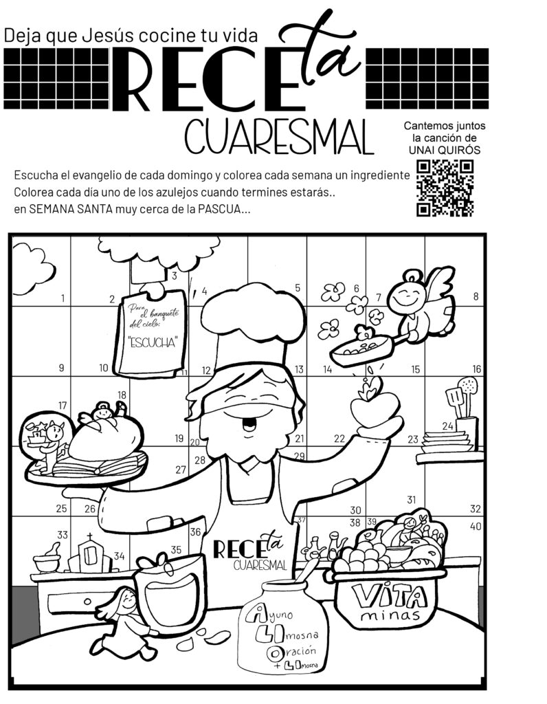 El proyecto combina los dibujos catequéticos del ilustrador Fano con las canciones del cantautor Unai Quirós y propone un itinerario semanal en el que la Palabra de Dios se presenta como una auténtica receta de vida. Cada domingo los pequeños recibirán una ficha para colorear, recortarán una parte del dibujo correspondiente y la irán pegando hasta completar su “receta cuaresmal”, de modo que puedan recordar en casa el mensaje del Evangelio escuchado en la Eucaristía.